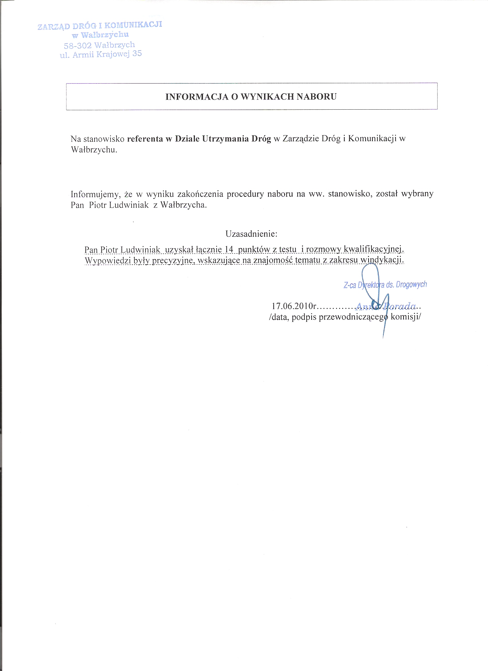 Wyniki naboru DO/110k/2/2010 referent Dział Utrzymania Dróg