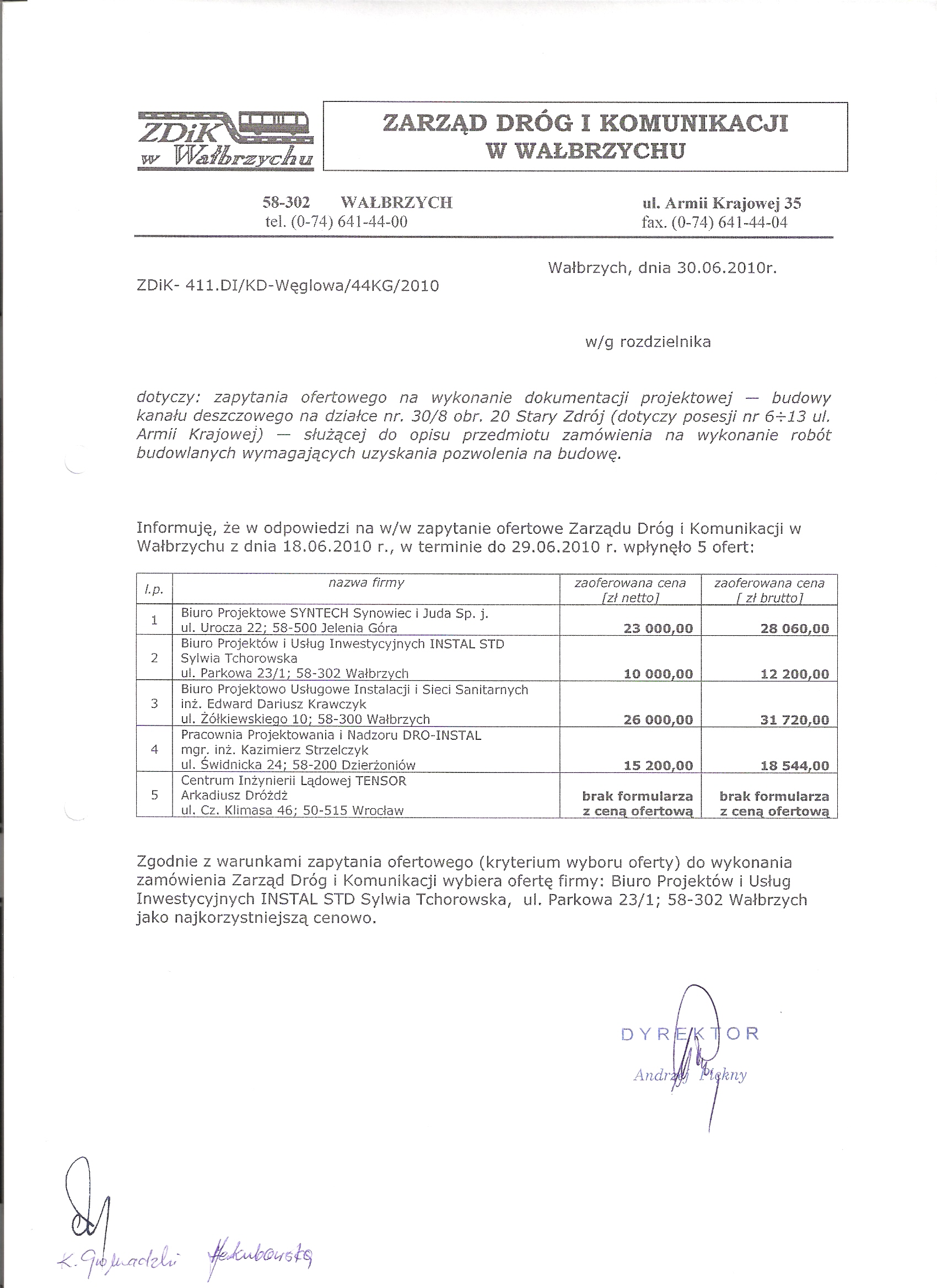 Wybór oferty - Projekt kanału deszczowego ul.Armii Krajowej ZDiK- 411.DI/KD-Węglowa/44KG/2010 - postać