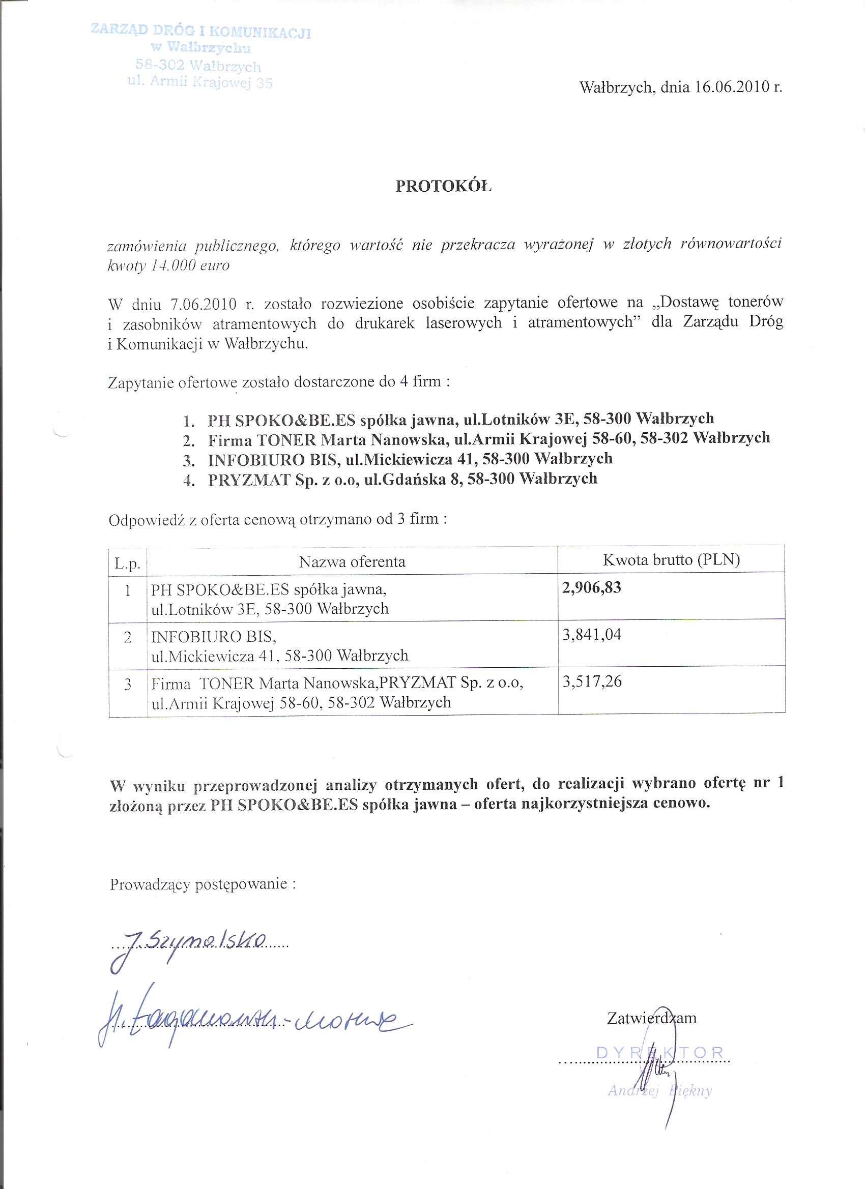 Wybór oferty DO/064/3/2010 dostawa tonerów w okresie 2010.07-12