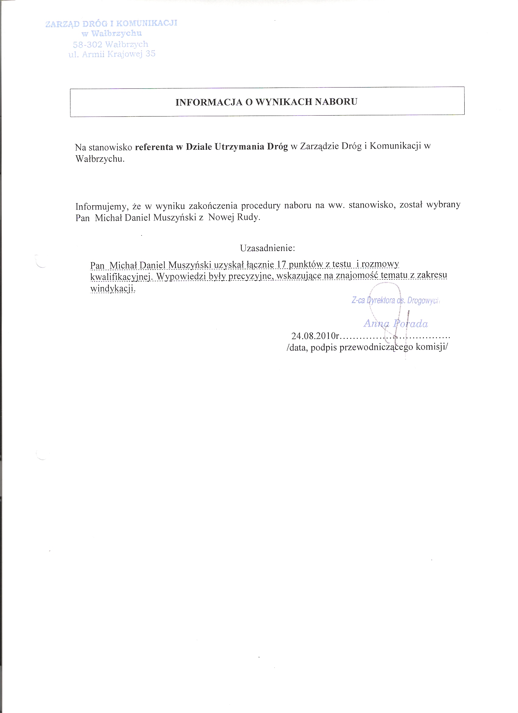 Wyniki naboru DO/110k/5/2010 - postać