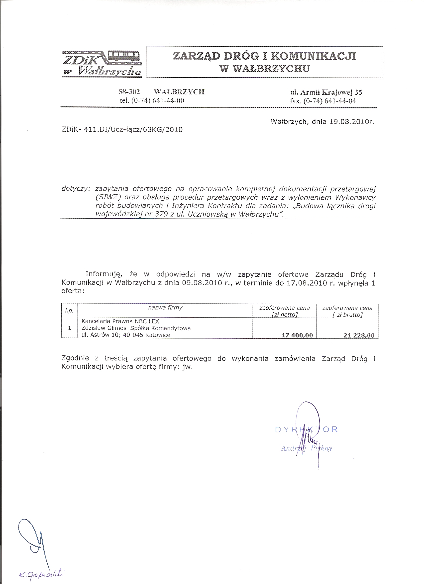 ZDiK-411.RO/Ucz-łącz/54/2010/KG Opracowanie kompletnej dokumentacji przetargowej (SIWZ) oraz obsługa procedur przetargowych wraz z wyłonieniem Wykonawcy robót budowlanych i Inżyniera Kontraktu dla zadania: 'Budowa łącznika drogi wojewódzkiej nr 379 z ul. Uczniowską w Wałbrzychu'