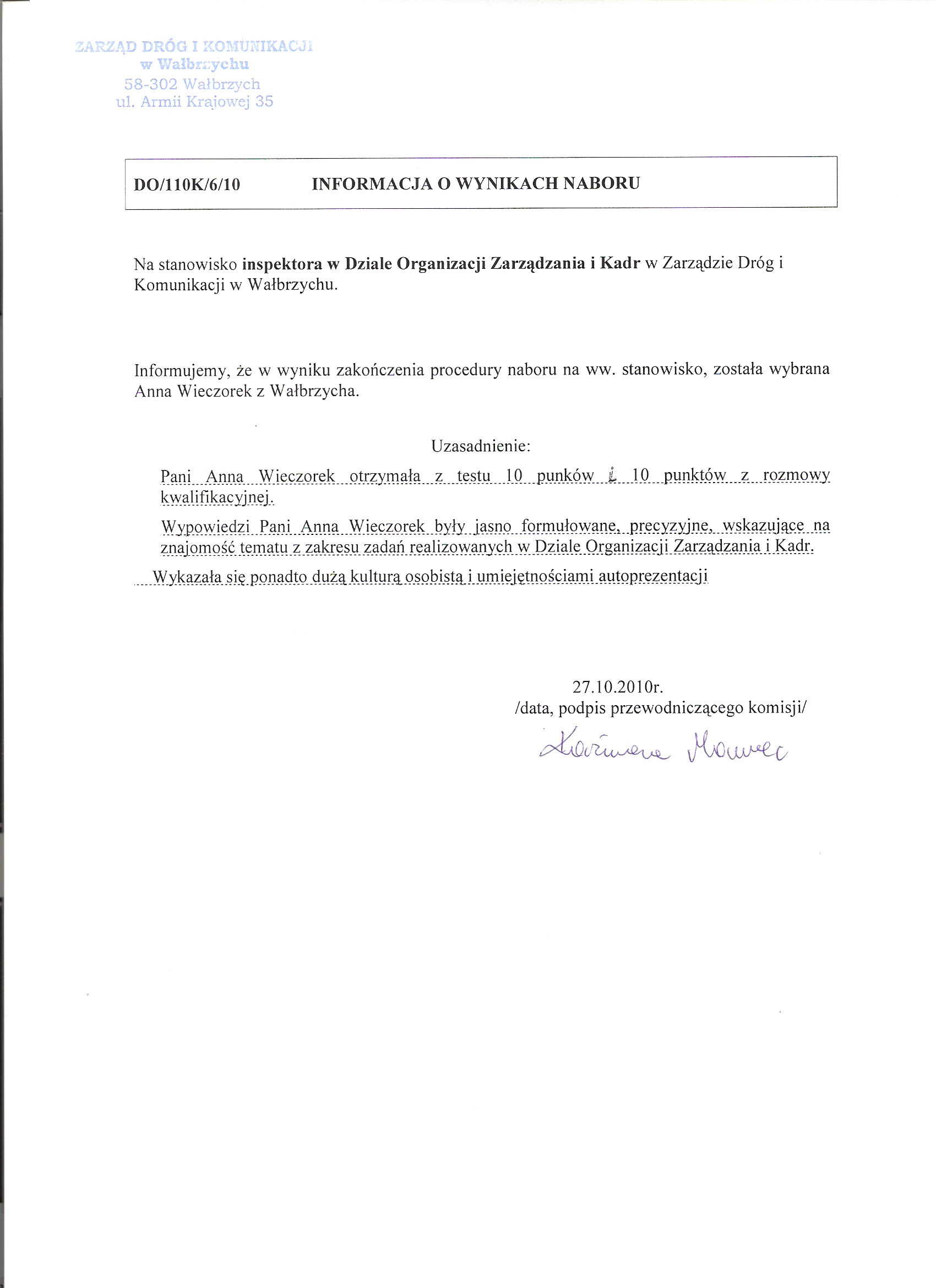 wyniki naboru DO/110k/6/2010 - postać