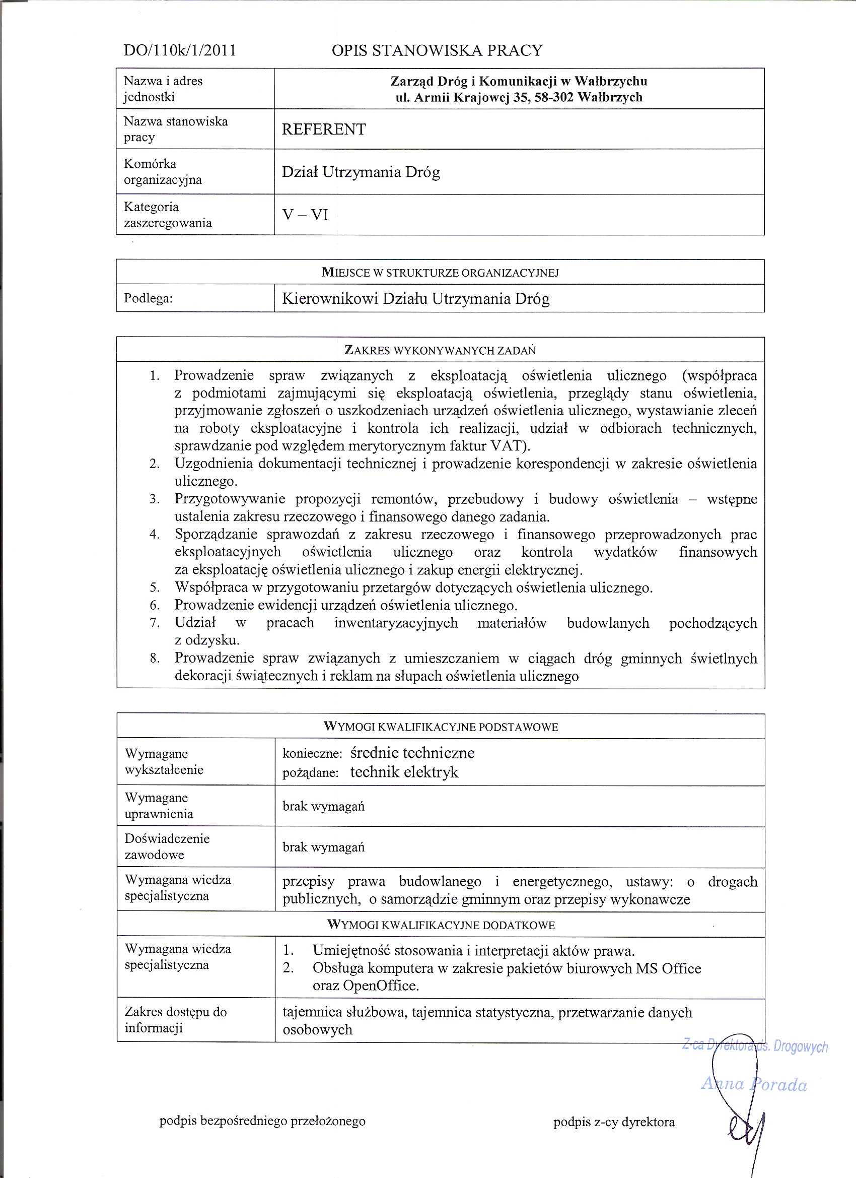 DO/110k/1/2011 Referent w Dziale Utrzymania Dróg